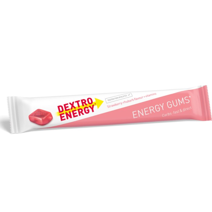 Dextro Energy Gums Strawberry-Rhubarb är fruktgummin är framtagna för atleter och dig som tränar för att ge en snabb energiboost. Fruktgummina har en konsistens som påminner om vingummin. Dextro Energy Gums innehåller kolhydrater och är berikad med vitamin B6 och B12. Smidig förpackning, ett bekvämt alternativ till sportgel. Veganska.