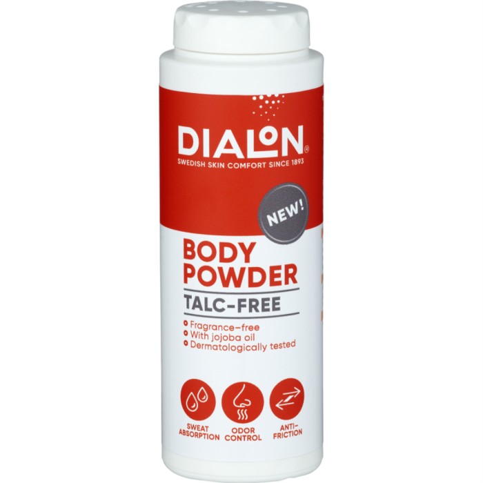 Dialon Body Powder är ett talkfritt kropppuder med majsstäkelse och jojobaolja. Kroppspudret kan användas för att motverka och minska skav och friktion vid idrottsutövning/styrketräning, samt som fuktabsorberande puder vid kraftiga svettningar till exempel mellan skinkorna, i ljumskarna samt på händer och fötter. Kropppuder används också efter vaxning eller rakning på exempelvis ben, armar, bikinilinje. Dermatologiskt testad och har ett praktiskt doseringslock.
