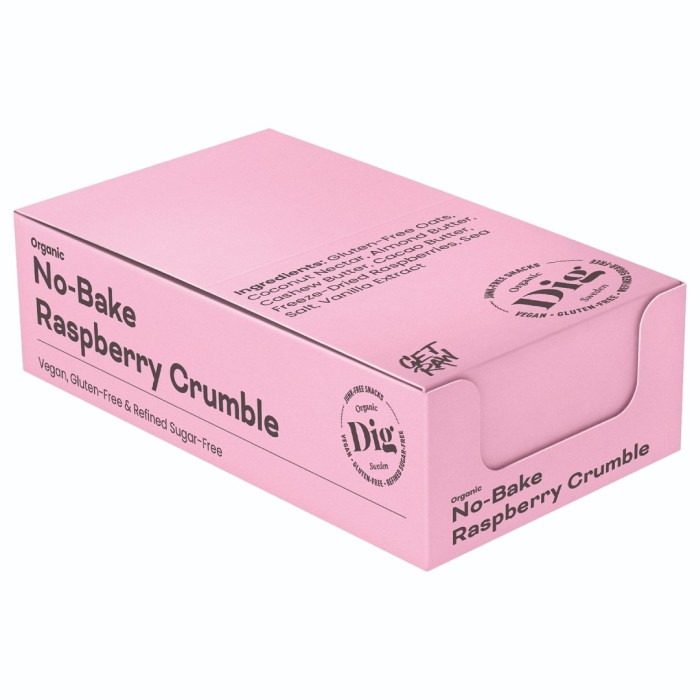 DIG Hallonsmulpaj är en vegansk, ekologisk och glutenfri råbar gjord på naturliga ingredienser. Hallonsmulpajen är gjord på bland annat havre, mandelsmör, kokosnektar och frystorkade hallon.