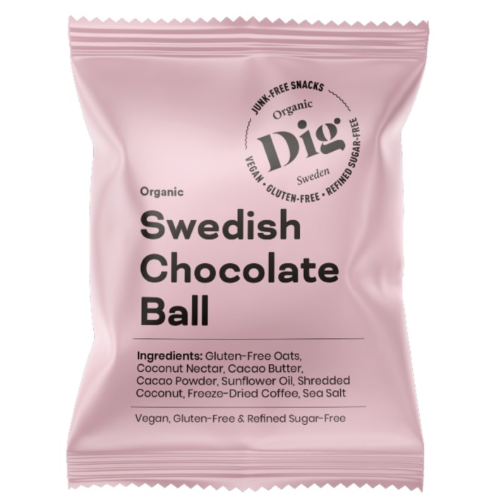 Den klassiska chokladbollen blev precis bättre! Dig Organic Chocolate Ball är en handgjord, ekologisk och vegansk chokladboll som innehåller bara 8 ingredienser. En boll innehåller 120 kcal.
