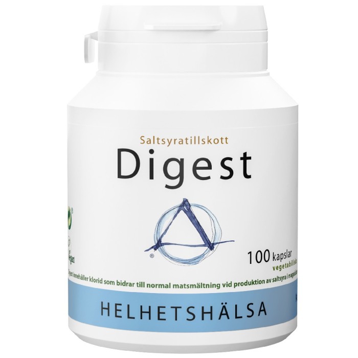 Helhetshälsa Digest saltsyratillskott är ett kosttillskott för matsmältningen. I magsäcken utsöndras naturligt saltsyra för att initiera proteinspjälkning. Helhetshälsa Digest innehåller klorid som bidrar till normal matsmältning vid produktion av saltsyra i magsäcken.