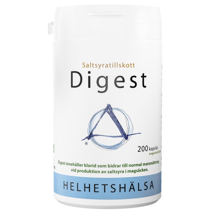 Helhetshälsa Digest saltsyratillskott är ett kosttillskott för matsmältningen. I magsäcken utsöndras naturligt saltsyra för att initiera proteinspjälkning. Helhetshälsa Digest innehåller klorid som bidrar till normal matsmältning vid produktion av saltsyra i magsäcken.