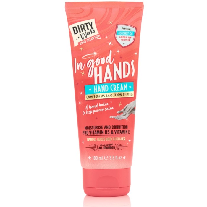 Dirty Works In Good Hands är en handkräm med allantoin, ett ämne som är naturligt skyddande för huden. Handkrämen innehåller också återfuktande jojobaolja och sheasmör och kakaosmör, två ingredienser som är kända för sina fuktgivande egenskaper.