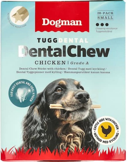 Tugg Dental från Dogman är tuggpinnar för hundar. Tuggpinnarna är gjorda med en mix av råhud och kyckling.