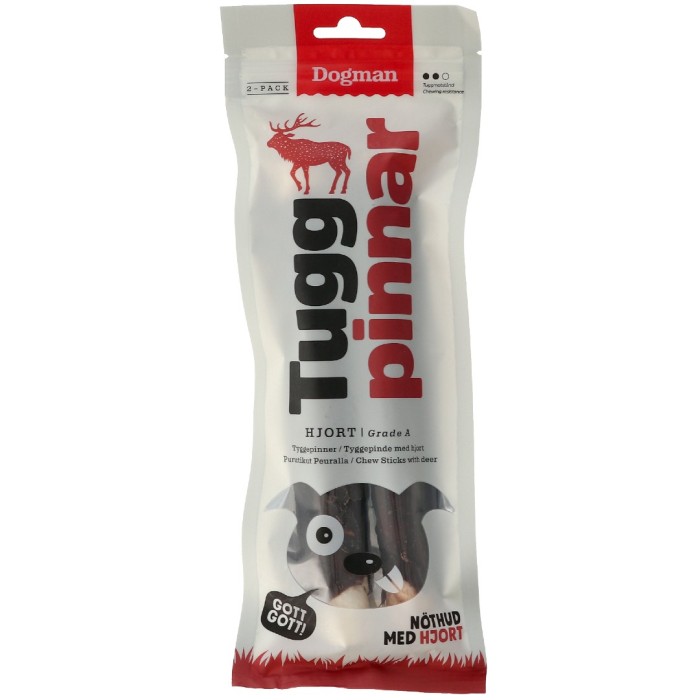 Tuggpinnar från Dogman med hjortkött lindat runt. 2-pack med två större tuggpinnar, 60 gram styck. Hjortköttet ger pinnarna extra god smak, och de passar därför även bra till kräsna eller känsliga hundar. Utan spannmål och tillsatt socker.