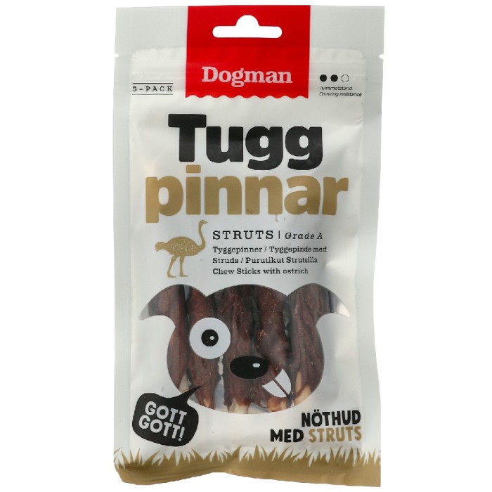 Tuggpinnar från Dogman med strutskött lindat runt, 5-pack. Strutsköttet ger pinnarna extra god smak, och de passar därför även bra till kräsna eller känsliga hundar. Utan spannmål och tillsatt socker.
