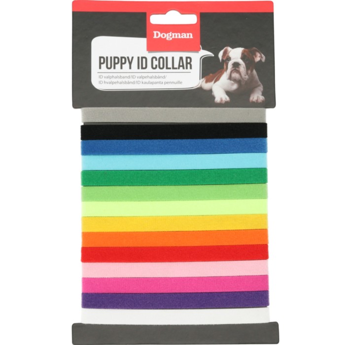 Markeringshalsband av kardborre till valpar. 14 olika färger. Valphalsband hjälper uppfödaren att skilja valparna åt i valplådan. 30 cm