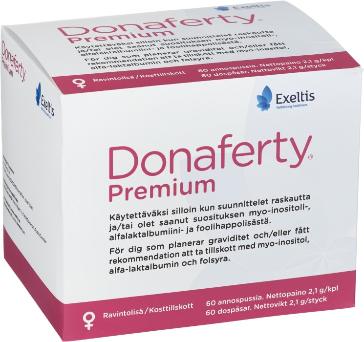 Donaferty Premium är en vidareutveckling av föregångaren Donaferty. Kosttillskottet innehåller ett patenterat komplex av Myo-inositol/alfa-laktalbumin och folsyra. Kombinationen med alfa-laktalbumin kan ge ökat upptag av myo-inositol. Inositol finns naturligt i kroppen och bidrar till insulin- och glukosomsättningen.