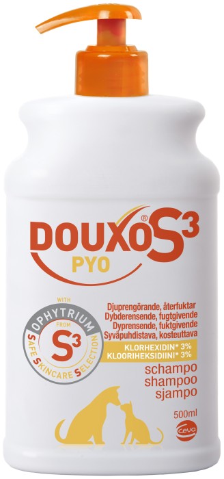 Douxo S3 Pyo schampo är ett desinficerande och djuprengörande shampo för oren hud för hund, katt och häst. Douxo schampo innehåller naturliga ingredienser och bidrar till en friskare hud och päls. Ophytrium (från växten Ophiopogon japonicus) verkar effektivt på de tre viktiga hudbariärerna: stärker den mekaniska hudbarriären, balanserar den mikrobiologiska och lugnar den immunologiska hudbarriären. Douxo S3 Pyo är återfuktande och vårdande och har en balsameffekt.
