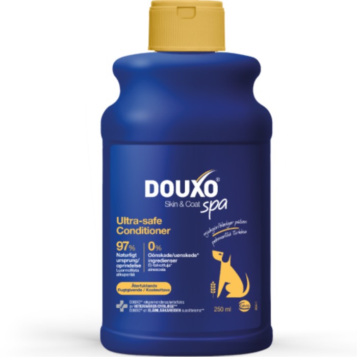 DOUXO Skin & Coat Spa Ultra-Safe Hydrating Conditioner är ett balsam för hundar, för en mjukare, glänsande päls och en återfuktad hud. Hydrating balsam är speciellt utvecklat för hundar med torr, känslig hud eller tovig päls. Det är berikat med havre, en naturlig källa till betaglukan, för att ge djup återfuktning och främja en stark, frisk och glänsande päls. Den hypoallergena formuleringen består av 97 % naturliga ingredienser. Balsamet reder skonsamt ut tovor och knutar och gör pälsen mjuk, silkeslen och lätt att reda ut efter varje användning.