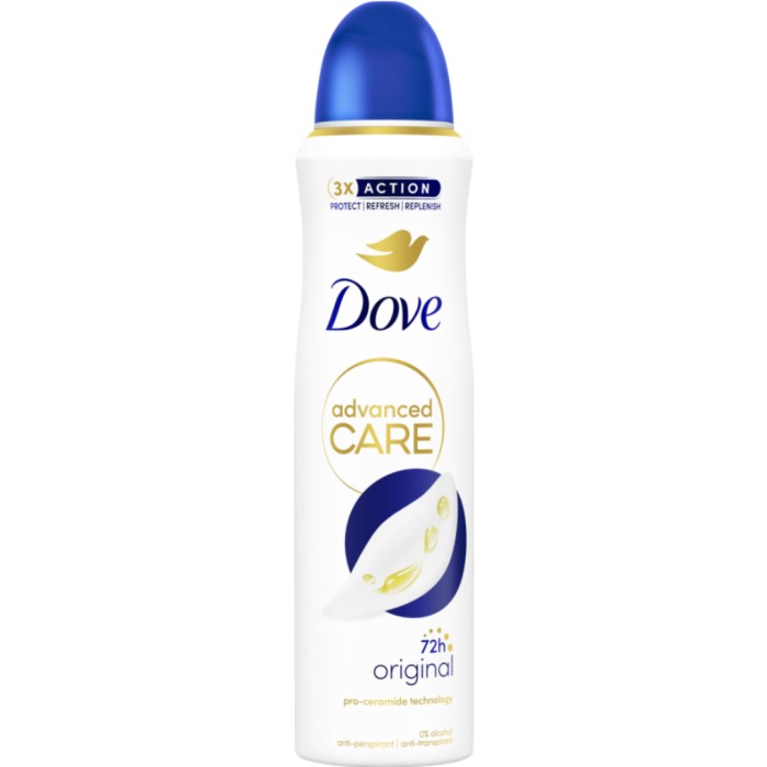 Dove 72h Advanced Care Original Antiperspirant Deo Spray vårdar huden samtidigt som den motverkar lukt och håller dig fräsch. Deodorant-sprayen ger en fräsch känsla med upp till 72 timmars skydd mot lukt och svett. Denna deo har Doves klassiska signaturdoft och kanske är den uppiggande deodorant du vill ha för att hålla dig fräsch under dagen. Den verkar för att skydda huden, och Doves avancerade formulering hjälper till att minska irritation under armarna som orsakas av rakning. Denna deodorant är skonsam mot huden då den innehåller Doves banbrytande pro-ceramide-teknologi som stärker hudens naturliga reparationsprocess, och bidrar till att minska irritation i armhålorna som kan uppstå vid rakning, samt ger en silkeslen hud.