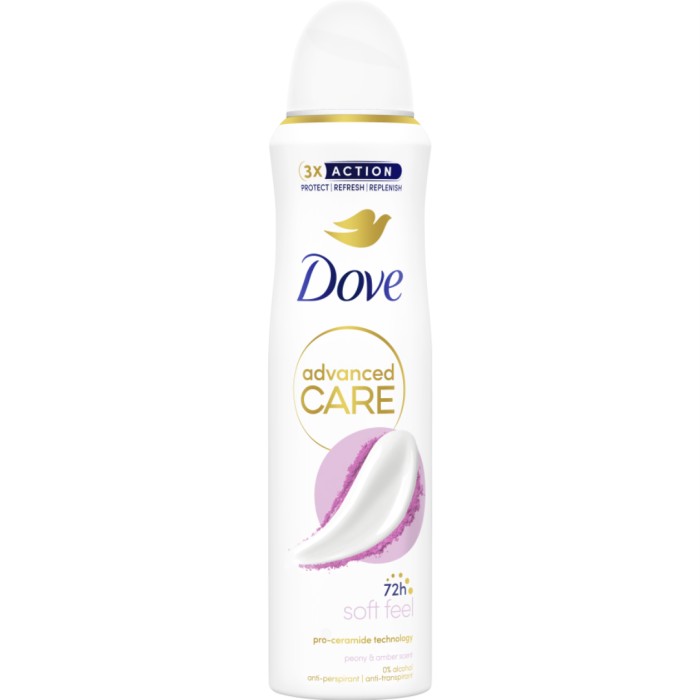 Dove 72h Advanced Care Soft Feel Antiperspirant deospray är en fuktgivande deodorant som är skonsam mot huden eftersom den innehåller Doves pro-ceramide-teknologi, som stärker hudens naturliga reparationsprocess och ger en silkeslen hud. Deodorantsprayen ger ett pålitligt skydd mot svett som varar i upp till 72 timmar, samtidigt som den återfuktar huden och ger en mjuk känsla. En skonsam antiperspirant utan alkohol.