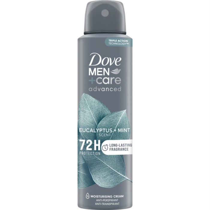 Dove Men+Care 72h Advanced Eucalyptus + Mint Antiperspirant Deo Spray för män ger 72 timmars skydd mot svett och lukt. Doves antiperspirant 72h Advanced är en deodorantspray som är tuff mot svett, men inte mot huden, och som lämnar en subtil doft som gör att du känner dig fräsch.
