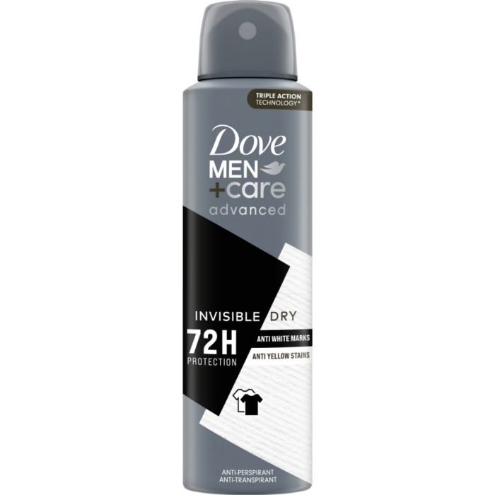 Dove Men+Care 72h Advanced Antiperspirant Deo Spray Invisible Dry för män skyddar mot svett och dålig lukt i 72 timmar. Denna vårdande deo-spray kombinerar kraftfullt skydd med en omedelbart fräsch känsla. Med Triple Moisture-teknologi ger den antiperspirantskydd i upp till 72 timmar. De kraftfulla antiperspiranta ingredienserna och den avancerade ¼ fuktgivande teknologin i formuleringen återfuktar och skyddar huden. Och den lämnar inte några vita eller gula fläckar på kläderna.
