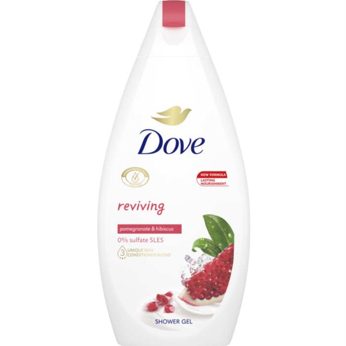 Dove Reviving Body Wash är en duschtvål framtagen för att du ska känna dig nyduschad och fräsch länge. Duschgelen innehåller växtbaserade ingredienser och doftar av granatäpple och hibuskus-te. Ger energi och återupplivar huden. Tvålen innehåller återfuktande ingredienser som finns naturligt i huden, för att göra huden mjuk samtidigt som den återställer hudens fuktbalans. Dove Reviving duschgel är fuktgivande och skonsam mot hudens mikrobiom och gör att huden känns len.