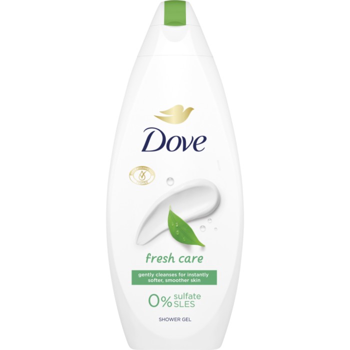 Dove Fresh Care duschtvål innehåller endast skonsamma ingredienser och rengör och vårdar huden så att den blir mjukare och lenare efter bara en dusch. Dove Fresh Care tar inte bort hudens naturliga fukt, utan gör så att huden förblir återfuktad och mjuk. Den ger också näring till huden samt är mikrobiomvänlig.