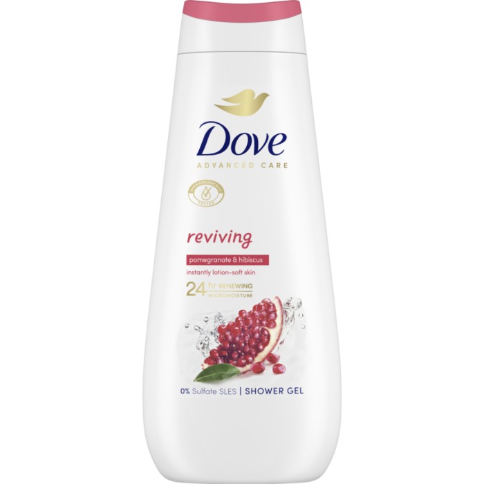 Dove Advanced Care Reviving duschtvål innehåller ingredienser som granatäpple och hibiskus och har ett lödder som hjälper till att ge huden ny vitalitet efter bara en dusch. Dove Advanced Care Reviving duschtvål innehåller MicroMoisture-teknologi, en teknik från Dove som tillför miljontals små men kraftfulla fuktgivande droppar, som kontinuerligt förnyar hudens naturliga fukt och ger näring i upp till 24 timmar – även efter att du har duschat. En närande duschkräm som ger huden ny energi och kanske lyfter sinnet. Dove Advanced Care Reviving har ett lätt, bubbligt lödder och ger huden energi med en fräsch doft av granatäpple och hibiskus.