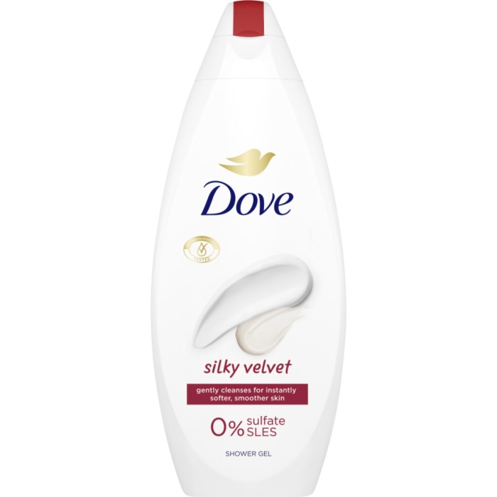Dove Silky Velvet är en mild duschtvål som rengör och vårdar huden så att huden känns mjukare och lenare efter bara en dusch. Silky Velvet-tvålen är framtagen för att vara mild och skonsam mot huden och göra duschen till en hudvårdsstund. Tvålen tar inte bort hudens naturliga fukt, utan hjälper huden att förbli återfuktad och mjuk. Den ger också näring åt huden och är mikrobiomvänlig.