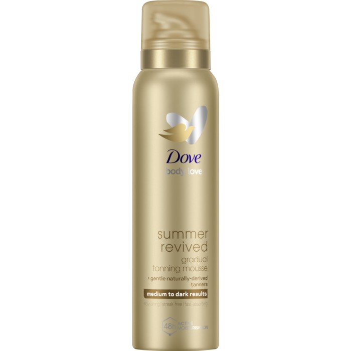 Tanning Mousse är en brun-utan-sol mousse från Dove i färgen Medium to Dark. Moussen ger en naturligt solbrun lyster för hela kroppen, och är framtagen för medium till mörka hudtoner.