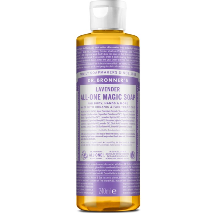 Dr Bronner's Lavender Liquid Soap är en tvål med en avkopplande doft av lavendel som lugnar både kroppen och sinnet. Alla oljor i Dr Bronners tvålar är ekologiskt certifierade för National Organic Standards Program. Dr Bronners kallar sina tvålar för "18-i-1-produkter". Du kan använda tvålen för att rengöra både dig själv (hud och hår), disken och hunden.