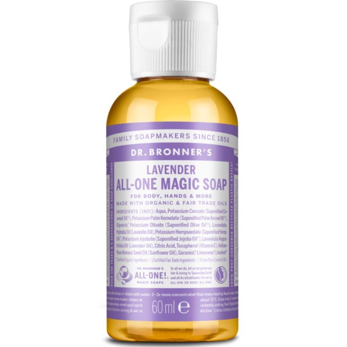 Aqua, Potassium Cocoate (Saponified Coconut Oil*‡), Potassium Palm Kernelate (Saponified Palm Kernel Oil*‡), Glycerin,* Potassium Olivate (Saponified Olive Oil*‡), Lavandula Hybrida Oil (Lavandin Oil), Potassium Hempseedate (Saponified Hemp Oil*), Potassium Jojobate (Saponified Jojoba Oil*), Lavandula Angustifolia Oil (Lavender Oil), Citric Acid, Tocopherol (Vitamin E), Helianthus Annuus Seed Oil (Sunflower Oil), Geraniol,? Limonene,? Linalool?