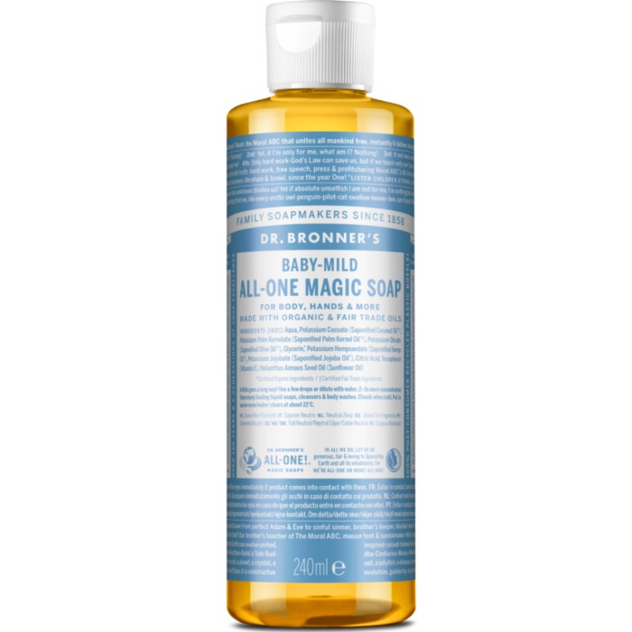 Dr Bronner Mild Unscented Liquid Soap är en oparfymerad tvål speciellt anpassad för dig med allergier eller känslig hud. Tvålen passar även bra för barn. Alla oljor och eteriska oljor är ekologiskt certifierade för National Organic Standards Program.