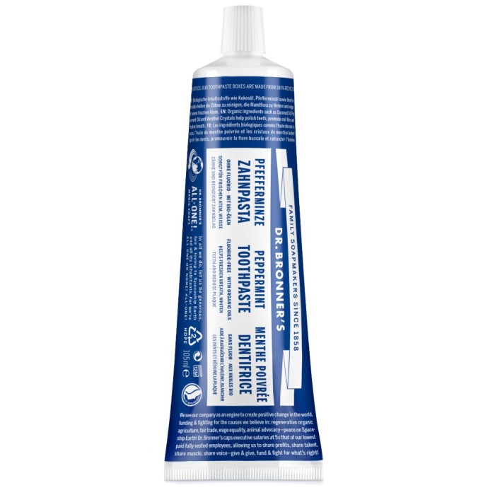 Dr Bronner Peppermint Toothpaste är en fluorfri tandkräm med en frisk smak av pepparmint. Tandkrämen har en lågt löddrande formula.