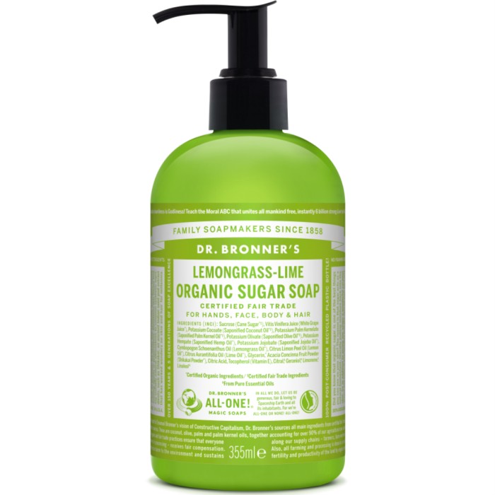 Dr Bronner Lemongrass Lime Organic Sugar Soap är en ekologisk flytande tvål. På Dr Bronner gillar man när en produkt har många användningsområden, så denna tvål kan du använda både till handtvätt, som duschtvål, för att tvätta ansiktet och håret.