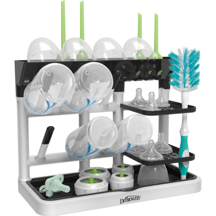 Dr. Browns Drying Tower är ett robust, vertikalt diskställ / torkställ med samma kapacitet som ett stort torkställ, och kan hålla glas-, plast- och rostfria kärl uppe och borta från bänkskivan. Torkstället har tre fack för förvaring av mindre tillbehör ingår, och det löstagbara bottenfacket samlar upp vatten under torkningen och gör det enkelt att rengöra.