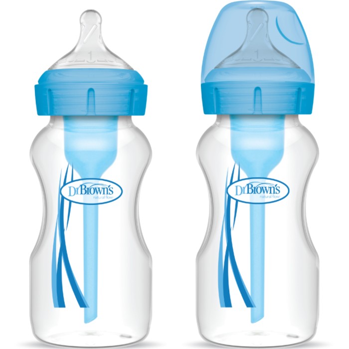 Dubbelpack med stycken blå Dr Brown nappflaskor som rymmer 270 ml. Nappflaskan har en unik ventil som tar bort luftbubblor och vakuum i vätskan. Barnet kan suga i sin egen takt och ventilen gör så att nappen inte kollapsar. När barnet blir större kan du ta bort ventilen och använda flaskan som en "vanlig" nappflaska.