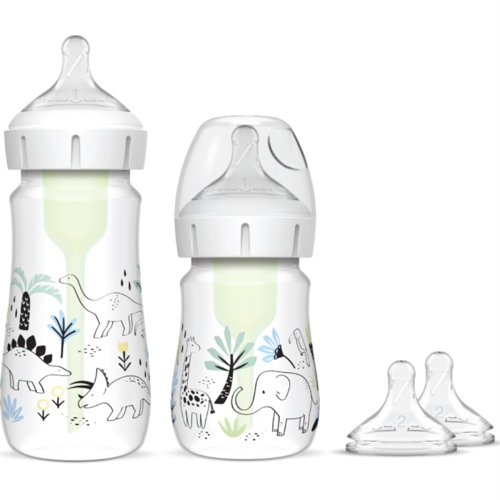 Dr.Brown Wide-Neck Options+ nappflaska har en unik ventil som tar bort luftbubblor och vakuum i vätskan för att motverka att barnet sväljer luft. Barnet kan suga i sin egen takt och ventilen gör så att nappen inte kollapsar. När barnet blir större kan du ta bort ventilen och använda flaskan som en "vanlig" nappflaska.