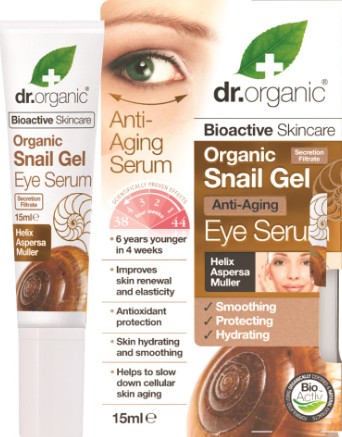 Ögonkrämen innehåller Helix Aspersia Muller, en substans som snigeln producerar för att snabbt återskapa sitt eget skal och hud vid skada. Denna ingrediens, kombinerat med ekologisk aloe vera och Dr Organics egen blandning av bioaktiva ingredienser lugnar och återfuktar huden.