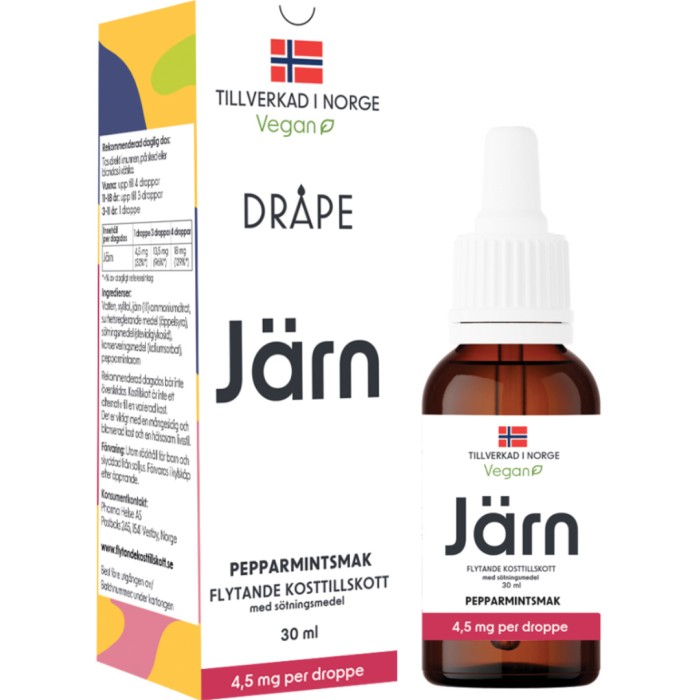Järn ingår i dropp-serien från Pharma Helse och kan kombineras med andra produkter i serien. Tillverkad i Norge.