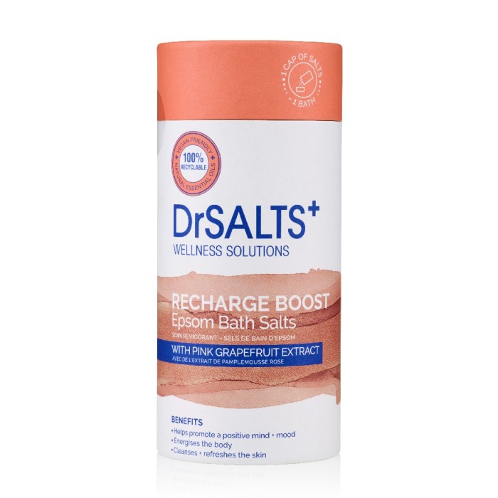 DrSALTS+ Recharge Boost badsalt kombinerar rena epsomsalter med en uppfriskande doft av eterisk olja från rosa grapefrukt. Ett bad med detta badsalt kanske kan hjälpa till att pigga upp och ge ny energi till både kropp och sinne efter en lång dag.