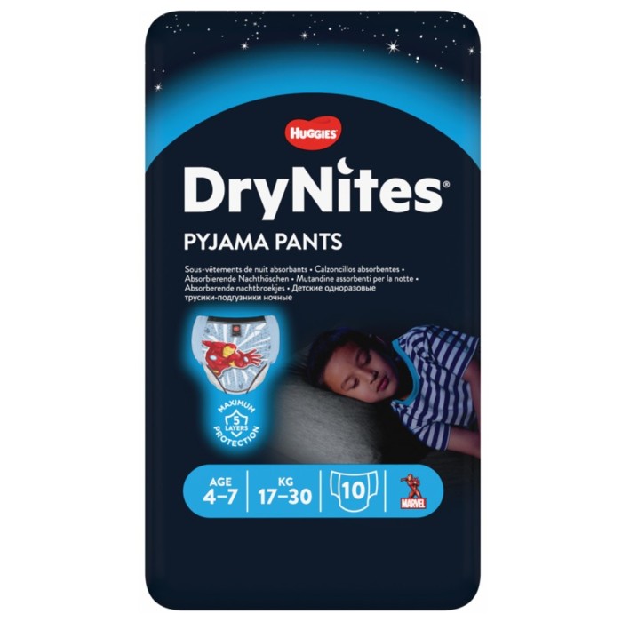 DryNites® Pyjama Pants är ett högabsorberande, diskret skydd framtaget för lite äldre barn. Nattbyxorna är försedda med skyddszoner och finns i två varianter för att vara särskilt anpassade för pojkar och flickor. DryNites® skyddar exakt där ditt barn behöver det som mest. Detta är DryNites för pojkar.