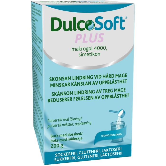 DulcoSoft Plus används för symtomatisk behandling av hård mage och lindrar känslan av uppblåsthet. DulcoSoft Plus återfuktar och mjukar upp hård avföring och bidrar till regelbundna tarmrörelser. Pulvret förebygger klumpbildning i tarmen av torr hård avföring (fekalom) och bidrar till att eliminera gaser och minskar känslan av uppsvälldhet och spänningar i magen. DulcoSoft Plus mjukgör hård mage utan att skapa ett plötsligt behov av att besöka toaletten.