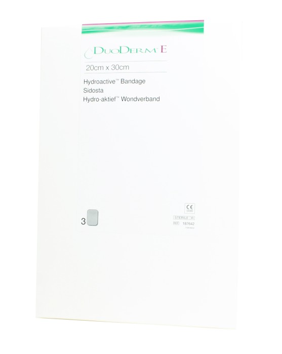 DuoDERM E förband är ett självhäftande förband som passar speciellt bra för mindre till måttligt vätskande svårläkta och akuta sår.