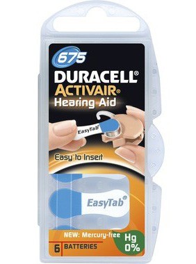 Duracell batteri Activair 675 är helt utan kvicksilver. Kan användas för huvudburna hörapparater av normalstorlek och hörglasögon.