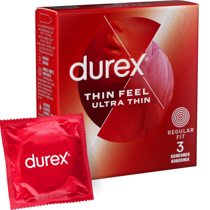Durex Thin Feel, Ultra Thin kondomer är designade för att öka känsligheten, så att du och din partner kan känna er ännu närmare varandra, utan att kompromissa med säkerheten. Durex Thin Feel, Ultra Thin kondomer är tillverkade av ultratunt latex, designade för att vara ännu tunnare än de vanliga kondomerna från Durex. Dessa kondomer kommer i ett paket med 3 stycken, så det är enkelt att ta med dem vart som helst.