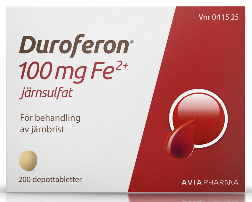 Duroferon innehåller järn som utlöses i jämn takt under lång tid vilket gör att kroppen lättare kan tillgodogöra sig det.