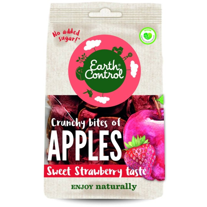 Apple Bites Strawberry från Earth Control är en påse med krisiga bitar av torkade äpplen som fått lite smak av jordgubbar.