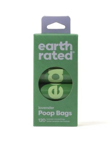 Earth Rated Poop Bag Refill till Earth Rated påshållare. 8-pack (8 rullar) där varje rulle innehåller 15 påsar, totalt 120 st påsar, med lavendeldoft.