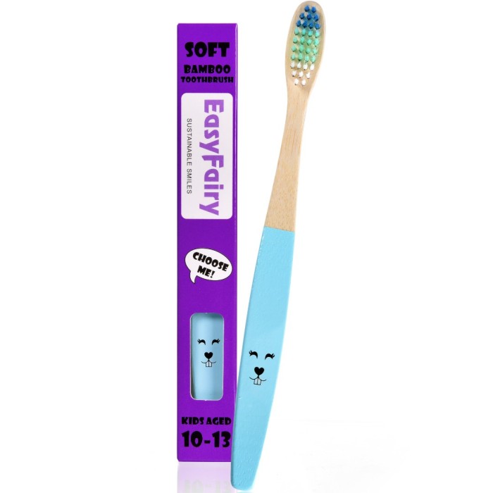EasyFairys tandborste för barn 10-13 år har ett lite längre skaft än de andra modellerna från EasyFairy, men fortfarande ett något kortare skaft än en vuxentandborste. Tandborsten har ett mellanstort borsthuvud med färgglada mjuka, koniska borststrån. De koniska (spetsiga) borststråna gör det lättare att komma åt mellan tänder som sitter tätt. Tandborsten har färgglada borststrån som är skonsamma för tandköttet, och på handtaget finns ett gulligt kaninansikte.