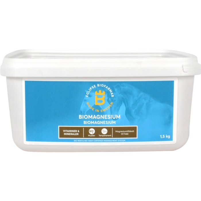 Biofarmab Bio Magnesium innehåller kelaterat magnesium med hög biotillgänglighet i form av en unik kombination av lättupptaglig magnesiumoxid, magnesiumfosfat och magnesiumkelat. Magnesium är en viktig makromineral för att bibehålla en god muskel- och nervfunktion, och kan ges till hästar som har lätt för att stressa upp sig i utsatta sitautioner. Magnesium finns även i skelettet och är viktig för skelettutvecklingen.
