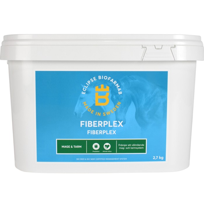 Fiberplex är ett foderkomplement för högpresterande hästar samt hästar som har oblans i tarmen. Bredspektra - ger en positiv inverkan på en stor del av matsmältningsapparaten. Kan vara gynnsam vid matsmältningsstörningar. Hög vattenhållande förmåga - kan vara lämplig att ge vid tillfälliga diarréer.
