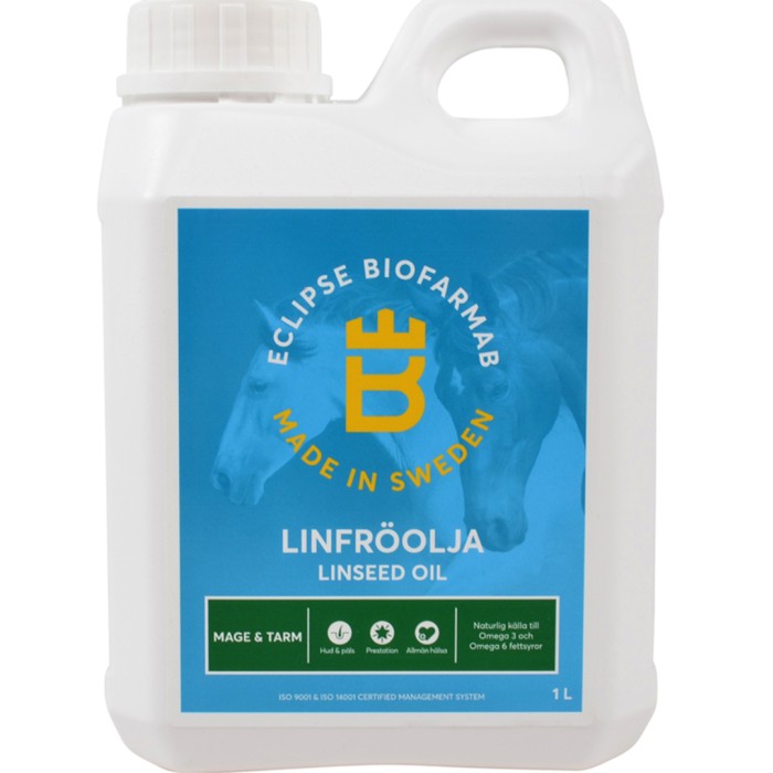 Eclipse Biofarmab Linfröolja är en svensk, kallpressad linfröolja med högt energiinnehåll och omega 3 och omega 6. Linfröolja kan ha positiva effekter på leder, hjärta/kärl, hud och matsmältning hos hästen. Ett skonsamt sätt att öka energimängden i fodret för den arbetande eller tävlande hästen.