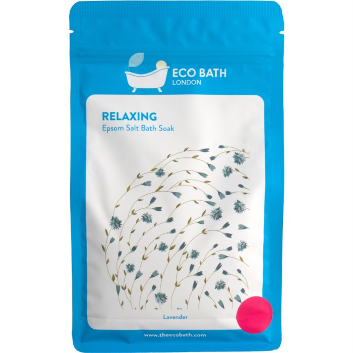Eco Bath London Relaxing Epsom Salt Bath Soak är ett badsalt med magnesiumsulfat av högsta renhetsgrad och en specialblandning av eteriska aromaterapioljor. När epsomsaltet löses upp i vatten frigörs magnesium- och sulfatjoner.
