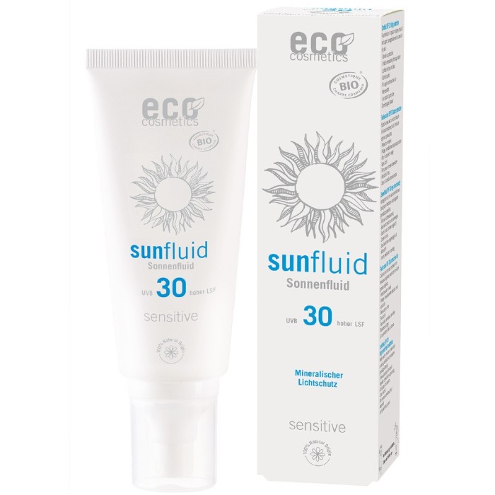 Eco Cosmetics Sun Fluid vårdar huden med en kombination av ekologisk hallonfröolja och ekologisk granatäpplefröolja.