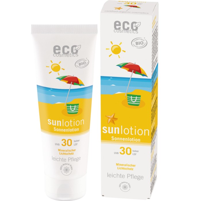 Eco Cosmetics Sollotion SPF30 med aloe vera & karanja är en ekologiskt certfierad sollotion. Denna sollotion med SPF 30 vårdar huden samtidigt som den skyddar effektivt mot solens skadliga UVA- och UVB-strålar. Den lätta lotionen går snabbt att applicera och den innovativa formuleringen med enbart zinkoxid som fysikaliskt UV-filter gör att solskyddet passar särskilt bra för normal och fet hud. Kan användas till både kroppen och ansiktet.