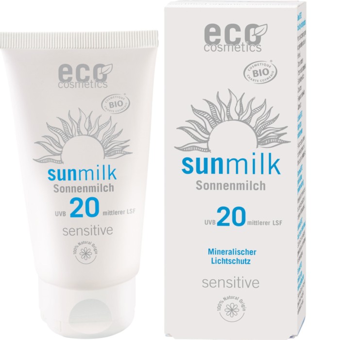 Eco Cosmetics Sun Milk SPF 20 är ett solskydd med fysikaliskt filter som kan användas både till ansiktet och till kroppen. Solkrämen innehåller granatäppleextrakt och hallonfröolja. Solskyddet innehåller fysikaliskt filter med titandioxid och obehandlad naturlig zinkoxid som reflekterar bort solens strålar (både UVA och UVB).
